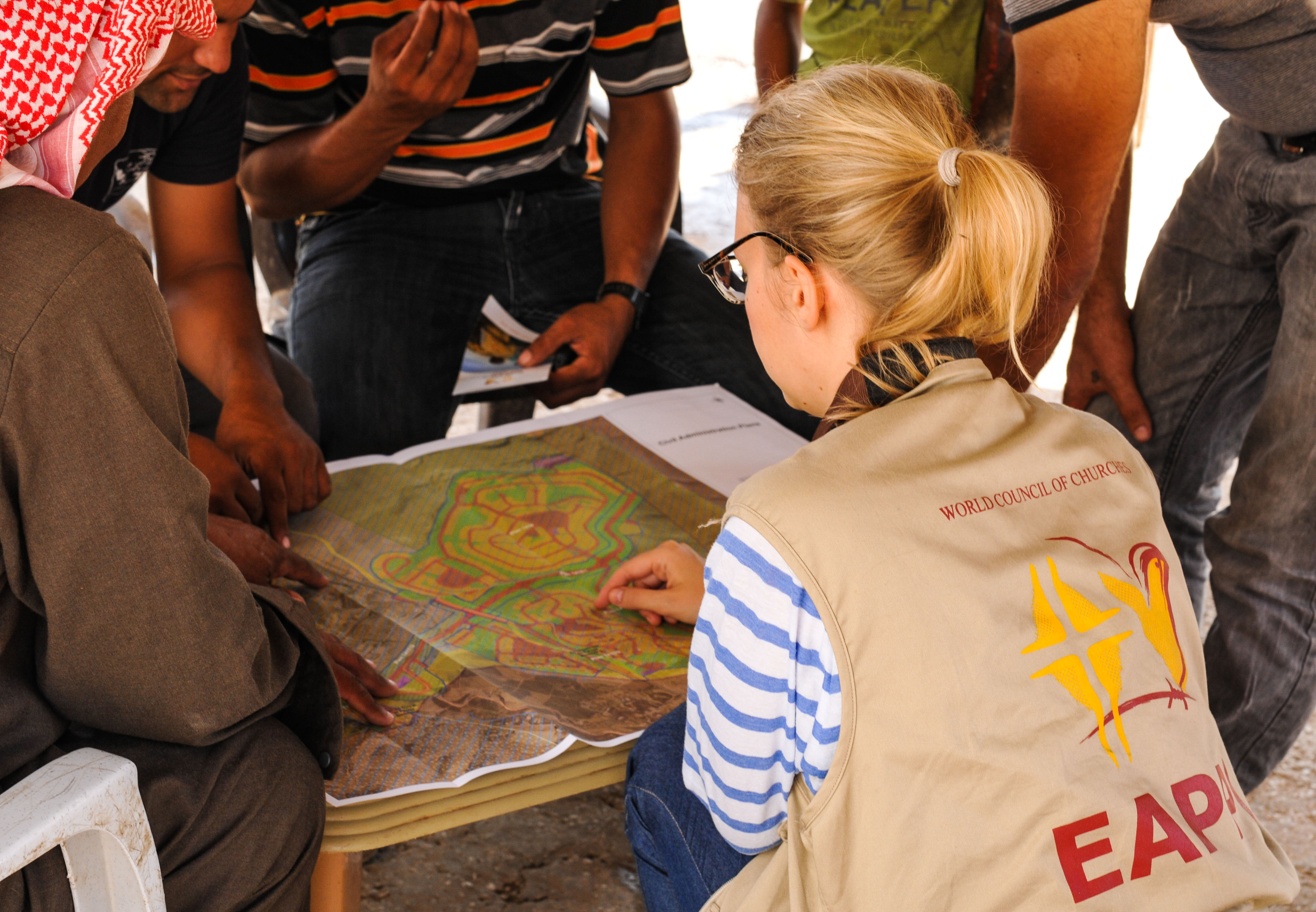 Vi ble invitert inn under solseilet til Abu Faysal og etter at vi hadde forklart han hvem vi var og vi hadde fått myntete og følte oss velkomne, hentet han fram et kart han hadde fått fra den israelske siviladministrasjonen for Vestbredden (Siviladministrasjonen er en militær avdeling som tar seg av sivilsaker i de okkuperte områdene og har ingen ting med den sivile forvaltningen i Israel å gjøre).
